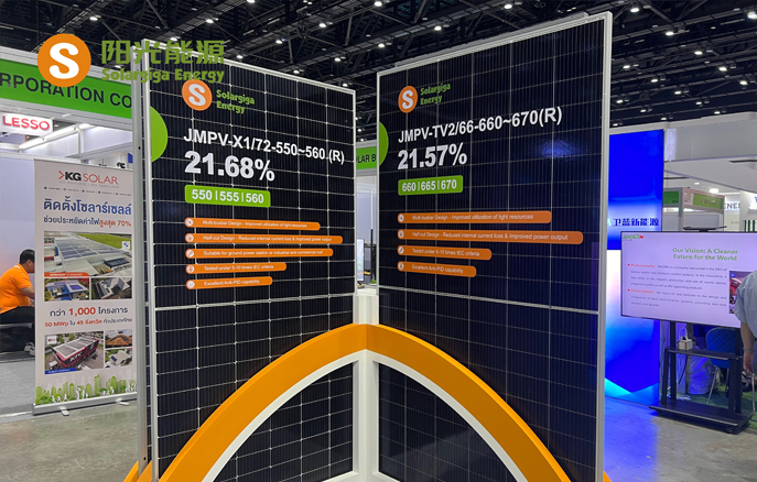 本屆展會(huì),陽(yáng)光能源帶來(lái)了1款N型組件和3款P型組件產(chǎn)品,現(xiàn)場(chǎng)工作人員向來(lái)訪客戶(hù)及觀眾詳細(xì)介紹了我司組件產(chǎn)品在不同場(chǎng)景下的實(shí)際應(yīng)用,涵蓋大型地面電站、工商業(yè)和住宅屋頂?shù)阮I(lǐng)域。值得一提的是,本屆展會(huì)展出的Giga-N系列組件基于182mm硅片,采用N型TOPCon電池技術(shù)并疊加雙面技術(shù),能夠?yàn)榻K端用戶(hù)帶來(lái)更高的收益率;此外,該款組件邊框采用聚氨酯材質(zhì),兼具優(yōu)異的力學(xué)性能和耐鹽霧、耐化學(xué)腐蝕性能,能夠應(yīng)對(duì)像泰國(guó)這種高濕高溫氣候的地區(qū),更堅(jiān)固、更安全、更可靠。