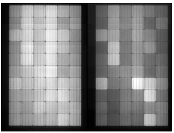 2019年9月,F(xiàn)raunhofer 實(shí)驗(yàn)室MatthiasPander團(tuán)隊(duì)公開(kāi)發(fā)表了《Prediction of potential power/field lossfrom LeTID susceptible modules》,論文對(duì)LeTID組件的功率衰減進(jìn)行了詳細(xì)的研究,如下圖為經(jīng)過(guò)690h測(cè)試后的單晶PERC組件EL照片,組件內(nèi)部的電池亮度均勻性變差,部分電池已經(jīng)呈現(xiàn)性能衰減。