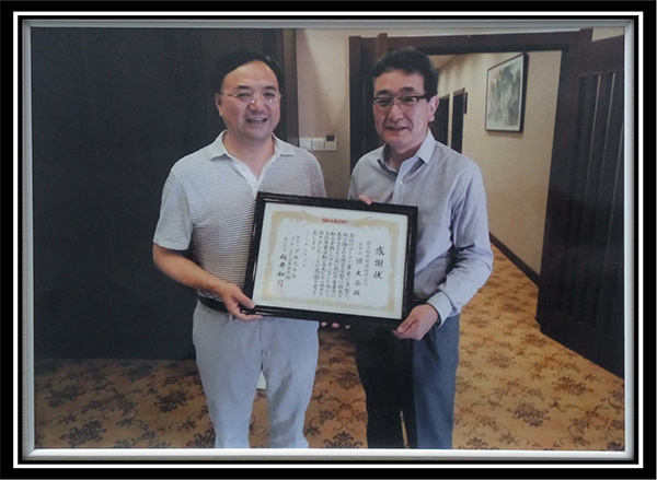 2013年9月,向井和司先生(右:夏普能源事業(yè)部本部長)為感謝陽光能源對夏普的支持和幫助,授予譚文華先生(左:錦州陽光能源董事長)感謝信。